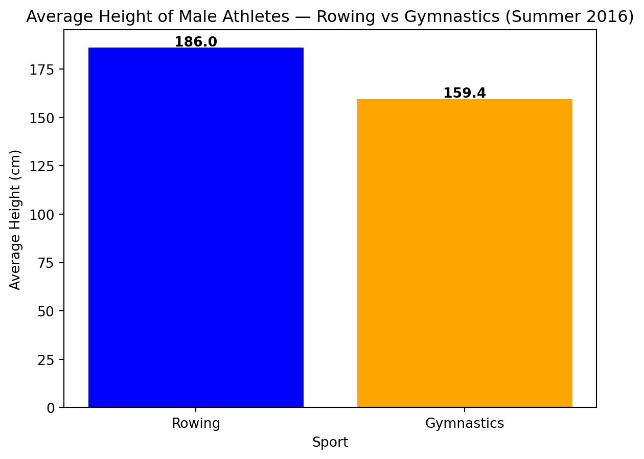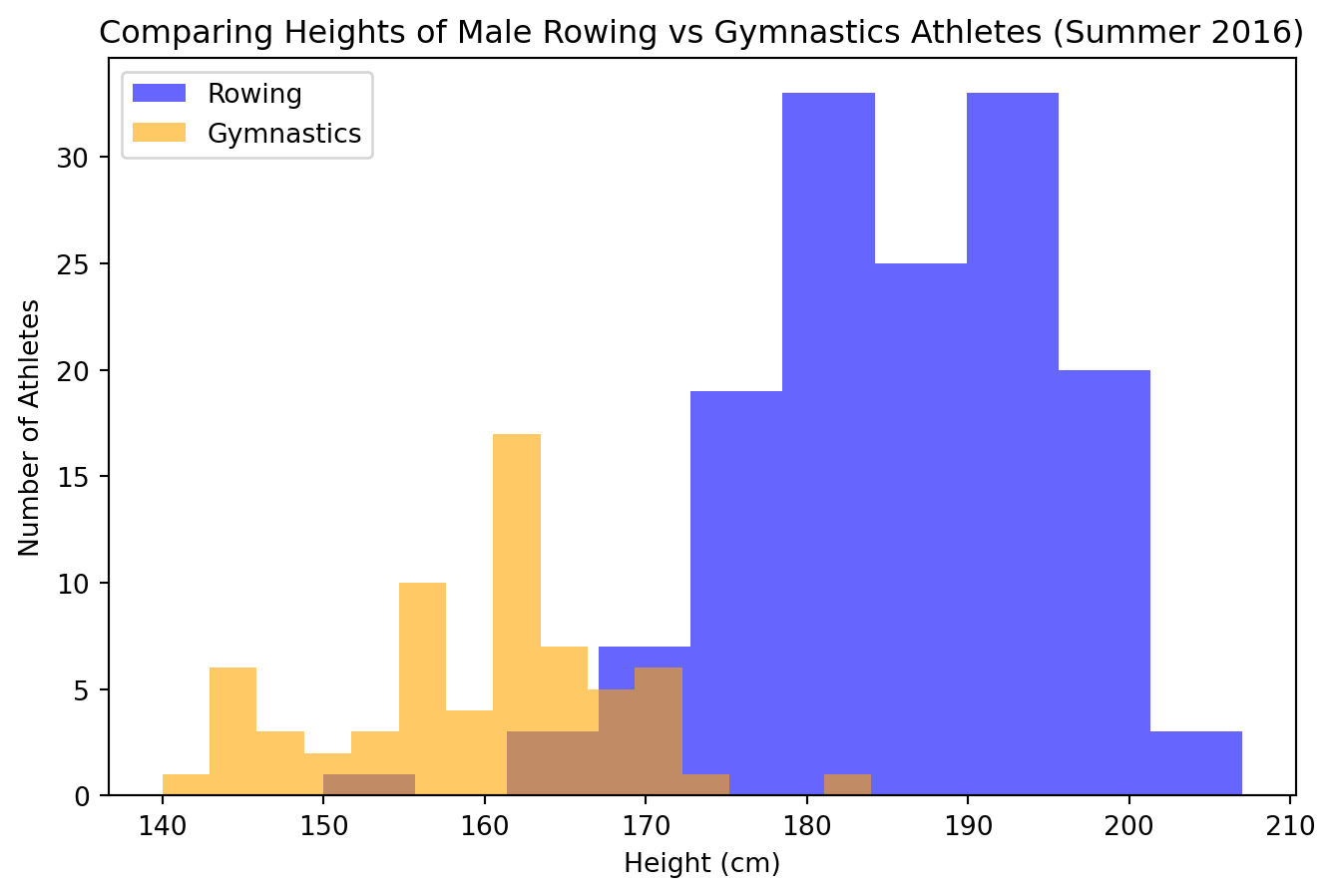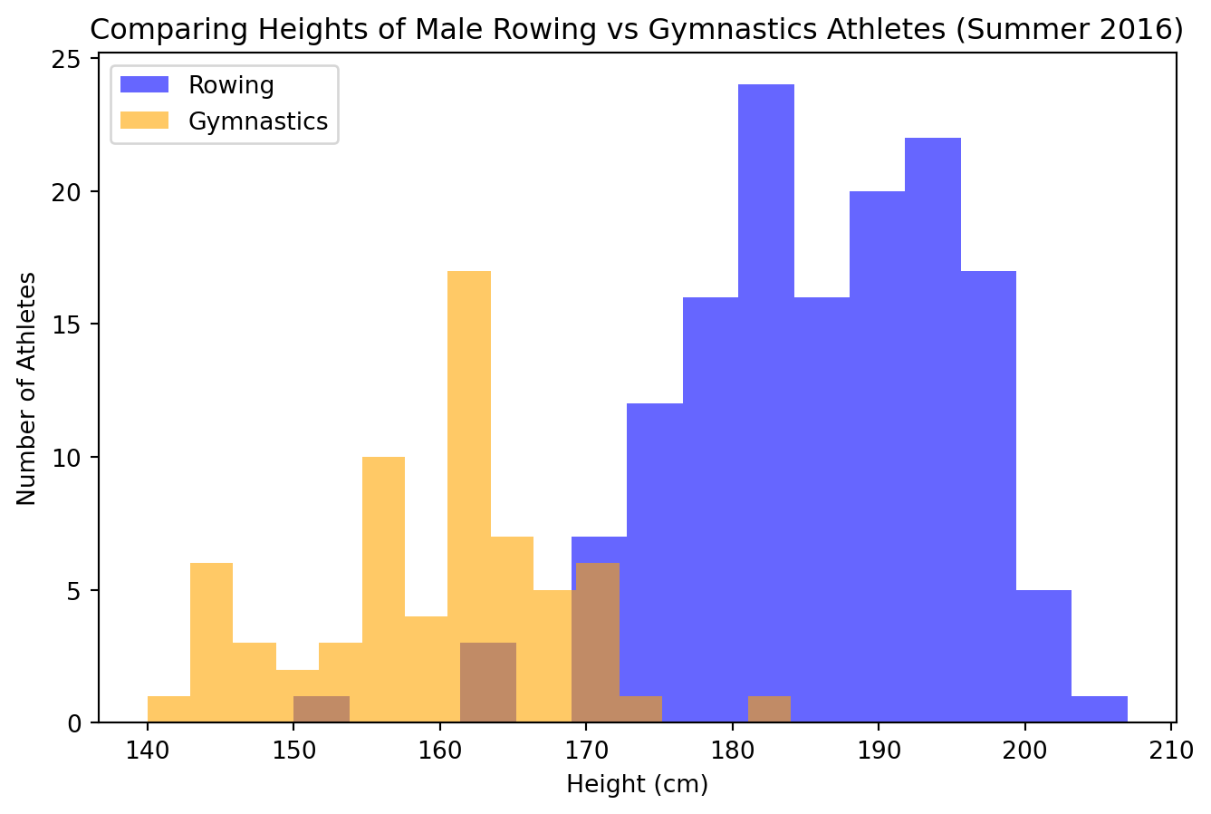 This is what this figure would look like. Importantly, at no point during the creation of this figure did we need to know how many different sports are recorded in the DataFrame. Our code would automatically add bars or reduce the number of bars, depending on the input data.