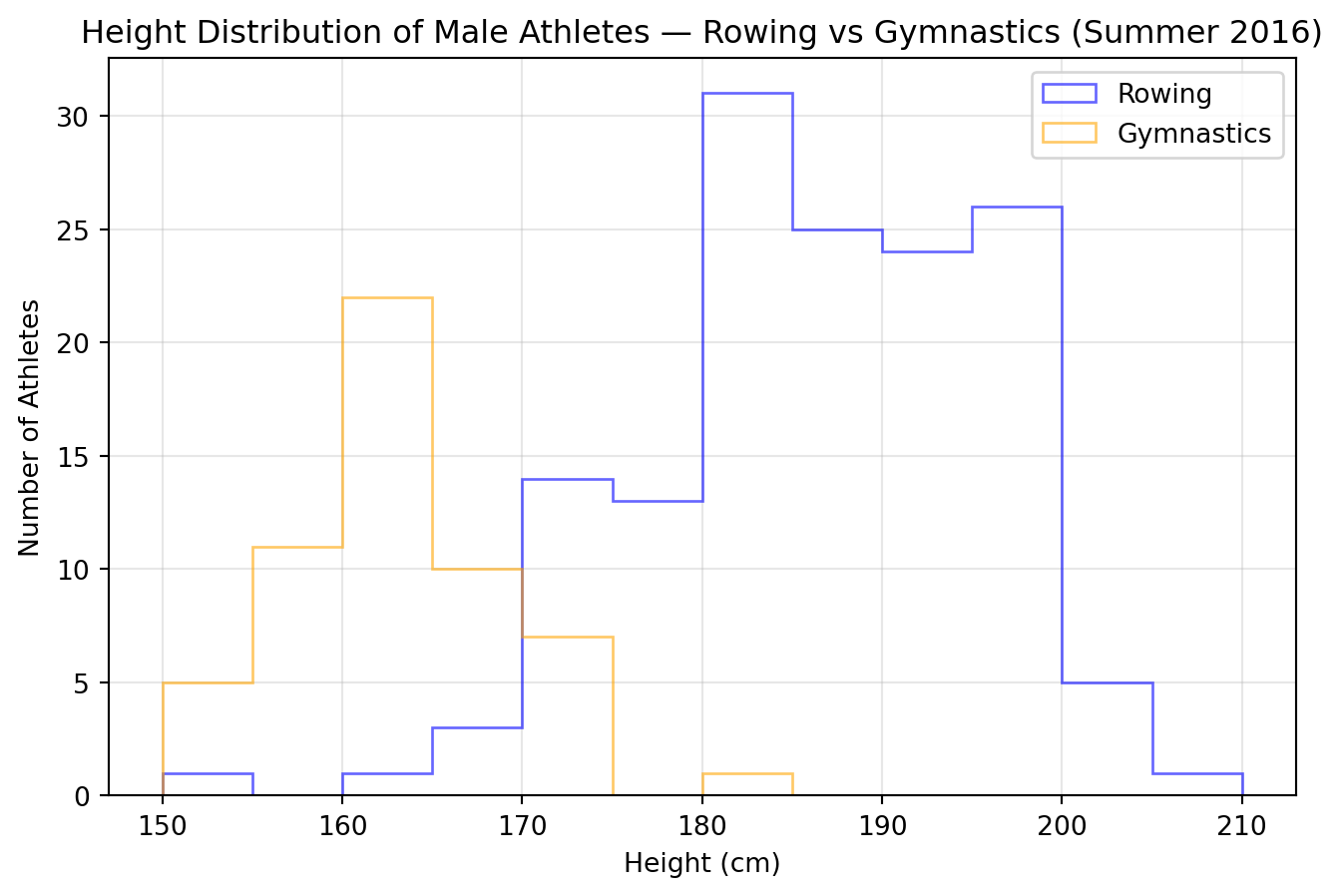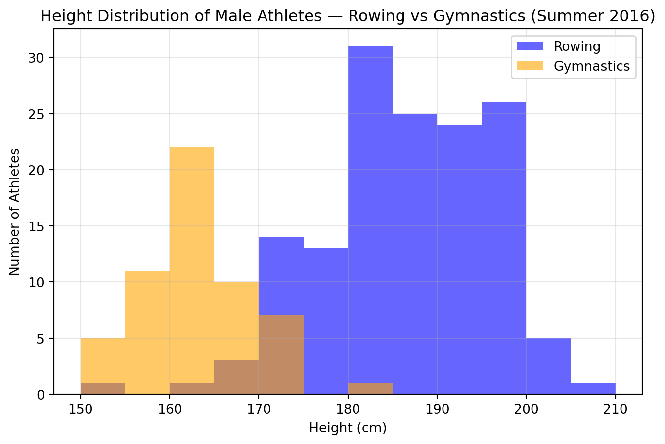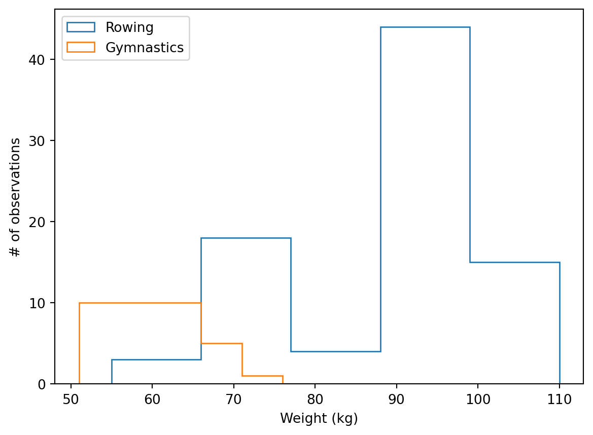 This is what this figure would look like. Importantly, at no point during the creation of this figure did we need to know how many different sports are recorded in the DataFrame. Our code would automatically add bars or reduce the number of bars, depending on the input data.