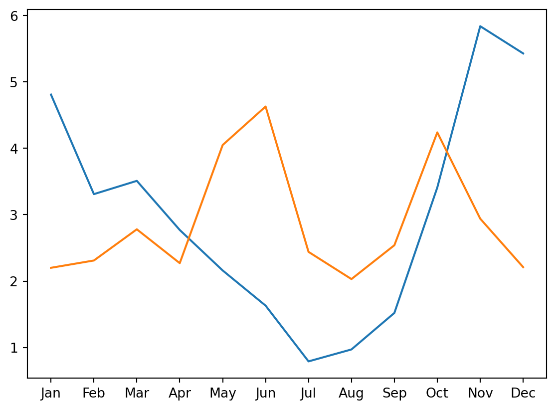 # Importing the course packagesimport pandas as pdimport numpy as npimport matplotlib.pyplot as plt# Importing the course datasets climate_change = pd.read_csv('datasets/climate_change.csv', parse_dates=["date"], index_col="date")medals = pd.read_csv('datasets/medals_by_country_2016.csv', index_col=0)summer_2016 = pd.read_csv('datasets/summer2016.csv')austin_weather = pd.read_csv("datasets/austin_weather.csv", index_col="DATE")weather = pd.read_csv("datasets/seattle_weather.csv", index_col="DATE")# Show first 5 dataset in weatherprint(weather.head(5))print(austin_weather.head(5))# Some pre-processing on the weather datasets, including adding a month columnseattle_weather = weather[weather["STATION"] =="USW00094290"] month = ["Jan", "Feb", "Mar", "Apr", "May", "Jun", "Jul", "Aug", "Sep", "Oct", "Nov", "Dec"] seattle_weather["MONTH"] = month austin_weather["MONTH"] = month# Create a Figure and an Axes with plt.subplotsfig, ax = plt.subplots()# Add data from the seattle_weather DataFrame by calling the Axes plot method.ax.plot(seattle_weather["MONTH"], seattle_weather['MLY-PRCP-NORMAL'])# Add data from the austin_weather DataFrame in a similar manner and call plt.show to show the results.ax.plot(austin_weather['MONTH'], austin_weather['MLY-PRCP-NORMAL'])# Call the show functionplt.show()