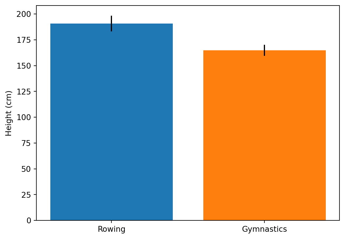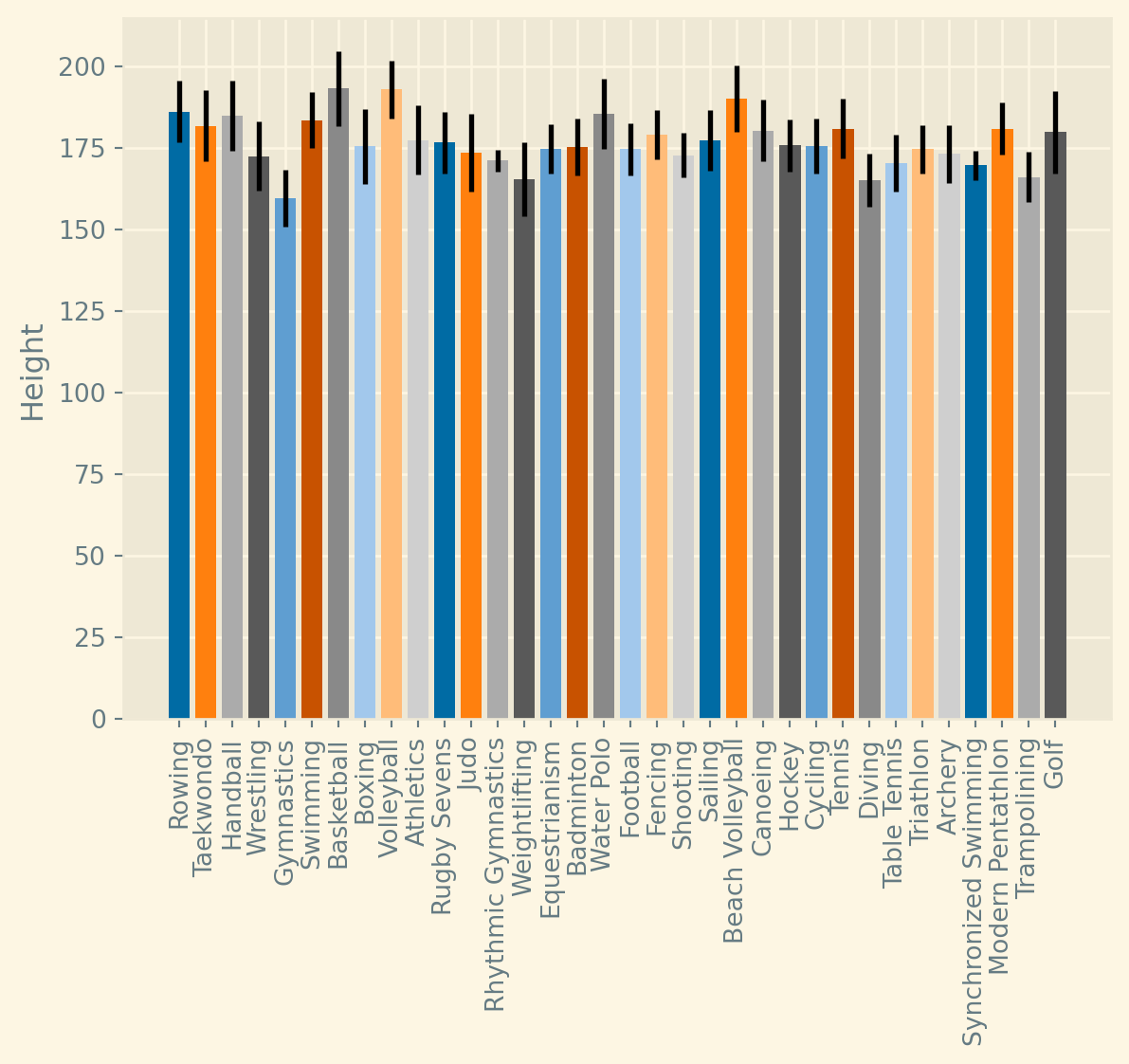 Let’s say that we would like to visualize the height of athletes in each one of the sports, with a standard deviation error bar. Given that we don’t know in advance how many sports there are in the DataFrame, once we’ve extracted the unique values, we can loop over them. In each iteration through, we set a loop variable called sport to be equal to one of these unique values. We then create a smaller DataFrame, that we call sport_df, by selecting the rows in which the "Sport" column is equal to the sport selected in this iteration. We can call the bar method of the Axes we created for this plot. As before, it is called with the string that holds the name of the sport as the first argument, the mean method of the "Height" column is set to be the height of the bar and an error bar is set to be equal to the standard deviation of the values in the column. After iterating over all of the sports, we exit the loop. We can then set the y-label to indicate the meaning of the height of each bar and we can set the x-axis tick labels to be equal to the names of the sports. As we did with the country names in the stacked bar chart that you saw in a previous lesson, we rotate these labels 90 degrees, so that they don’t run over each other.