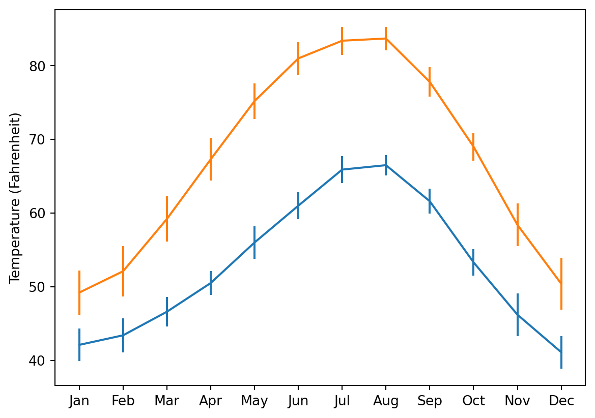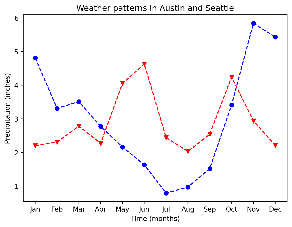 Pass the marker key-word arguments to these commands to set the Seattle data to circle markers (‘o’) and the Austin markers to triangles pointing downwards (‘v’).