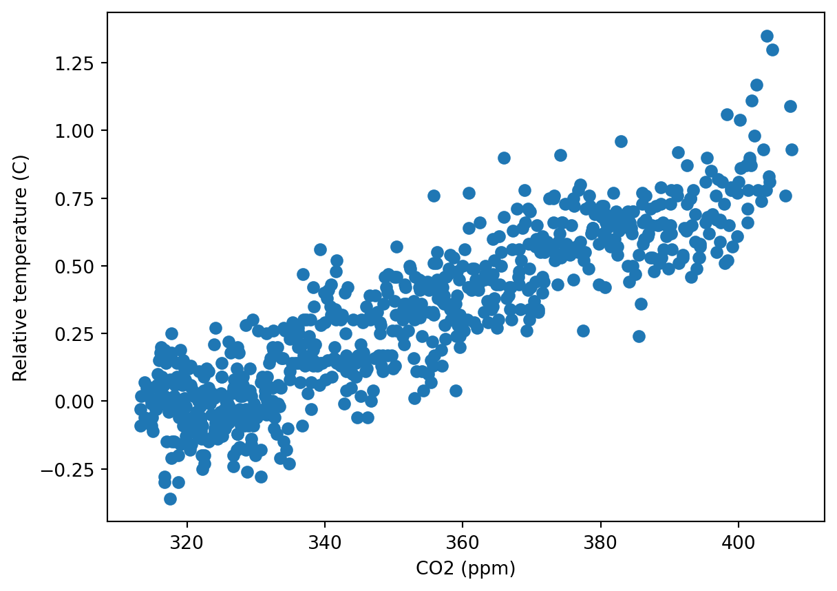 A standard visualization for bi-variate comparisons is a scatter plot. Let’s look at an example. We’ll use the climate change data that we have used previously. Recall that this dataset has a column with measurements of carbon dioxide and a column with concurrent measurements of the relative temperature. Because these measurements are paired up in this way, we can represent each measurement as a point, with the distance along the x-axis representing the measurement in one column and the height on the y-axis representing the measurement in the other column. To create this plot, we initialize a Figure and Axes objects and call the Axes scatter method. The first argument to this method will correspond to the distance along the x-axis and the second argument will correspond to the height along the y-axis. We also set the x-axis and y-axis labels, so that we can tell how to interpret the plot and call plt.show to display the figure.