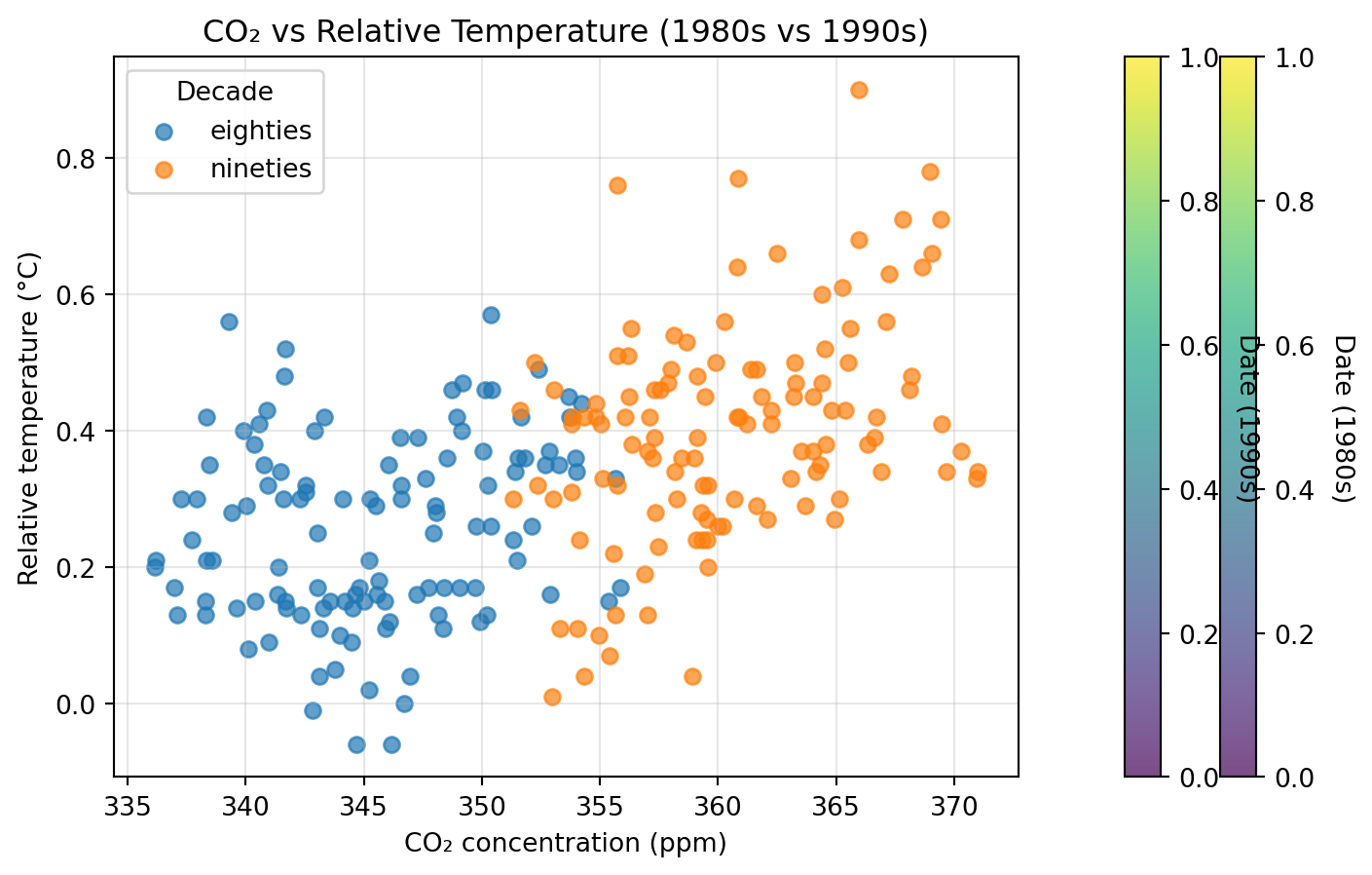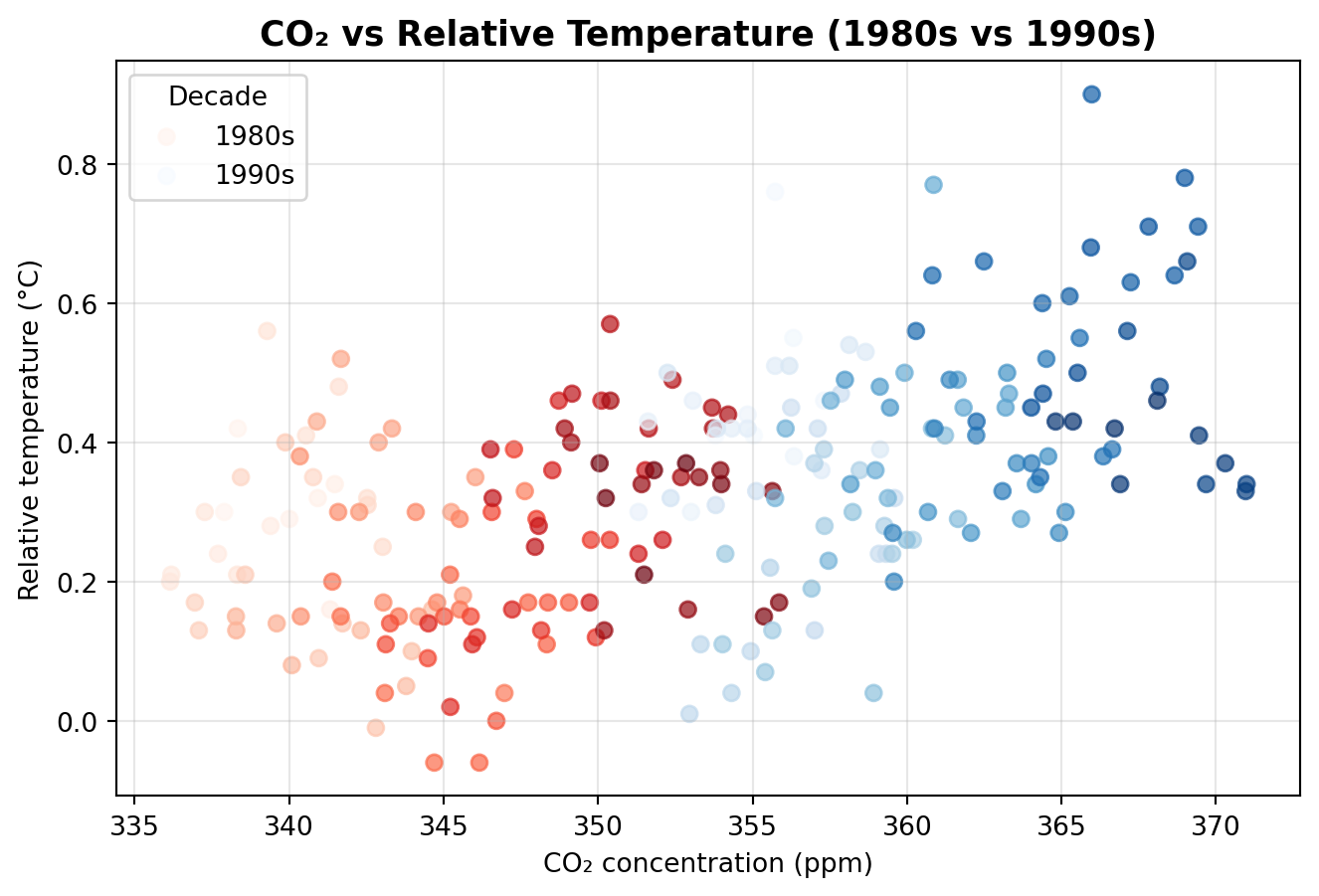 # 📘 Title: Comparing CO₂ Levels and Relative Temperature — 1980s vs 1990simport pandas as pdimport matplotlib.pyplot as plt# Load the datasetclimate_change = pd.read_csv('datasets/climate_change.csv', parse_dates=["date"], index_col="date")# Preview first few rowsprint(climate_change.head())# Create the figure and axesfig, ax = plt.subplots(figsize=(8, 5))# 🔹 Convert DatetimeIndex to numeric (ordinal values)eighties_numeric = eighties.index.map(pd.Timestamp.toordinal)nineties_numeric = nineties.index.map(pd.Timestamp.toordinal)# Add scatter plot for the 1980s, color encoded by timeax.scatter( eighties["co2"], eighties["relative_temp"], c=eighties_numeric, cmap="Reds", label="1980s", alpha=0.7)# Add scatter plot for the 1990s, color encoded by timeax.scatter( nineties["co2"], nineties["relative_temp"], c=nineties_numeric, cmap="Blues", label="1990s", alpha=0.7)# Customize the plotax.set_title("CO₂ vs Relative Temperature (1980s vs 1990s)", fontsize=13, weight="bold")ax.set_xlabel("CO₂ concentration (ppm)")ax.set_ylabel("Relative temperature (°C)")ax.legend(title="Decade")ax.grid(alpha=0.3)# Display the plotplt.show()