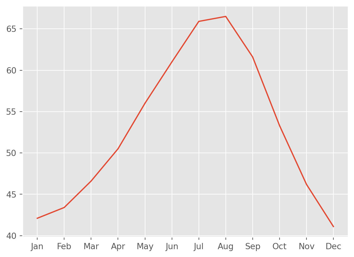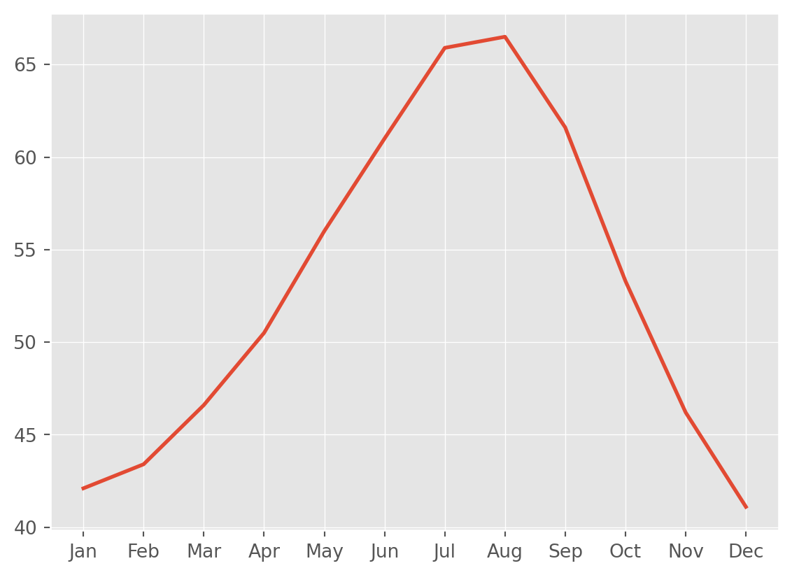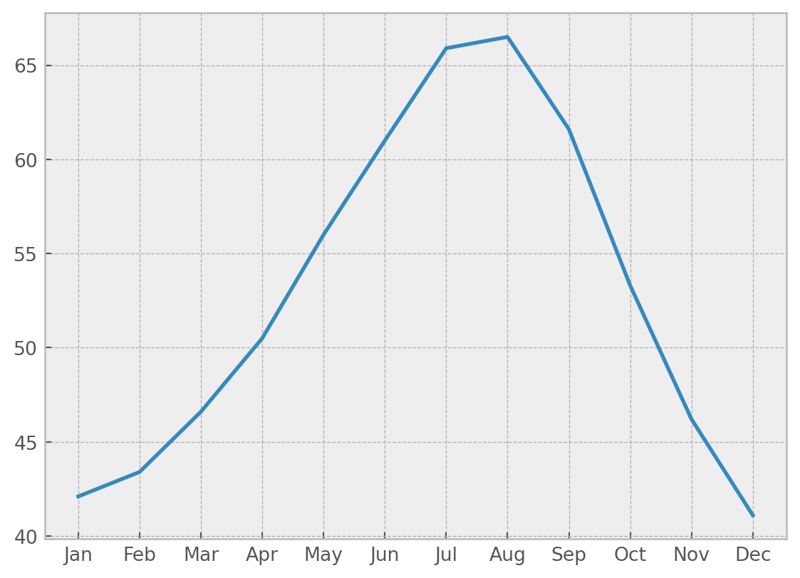 # Importing the course packagesimport pandas as pdimport numpy as npimport matplotlib.pyplot as plt# Importing the course datasets austin_weather = pd.read_csv("datasets/austin_weather.csv", index_col="DATE")weather = pd.read_csv("datasets/seattle_weather.csv", index_col="DATE")# Some pre-processing on the weather datasets, including adding a month columnseattle_weather = weather[weather["STATION"] =="USW00094290"] month = ["Jan", "Feb", "Mar", "Apr", "May", "Jun", "Jul", "Aug", "Sep", "Oct", "Nov", "Dec"] seattle_weather["MONTH"] = month austin_weather["MONTH"] = month# Use the "bmh" style and create new Figure/Axesplt.style.use("bmh")fig, ax = plt.subplots()ax.plot(seattle_weather["MONTH"], seattle_weather["MLY-TAVG-NORMAL"])plt.show()