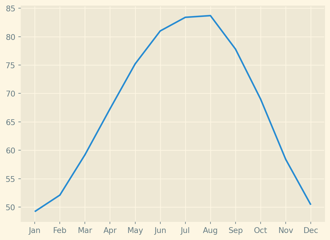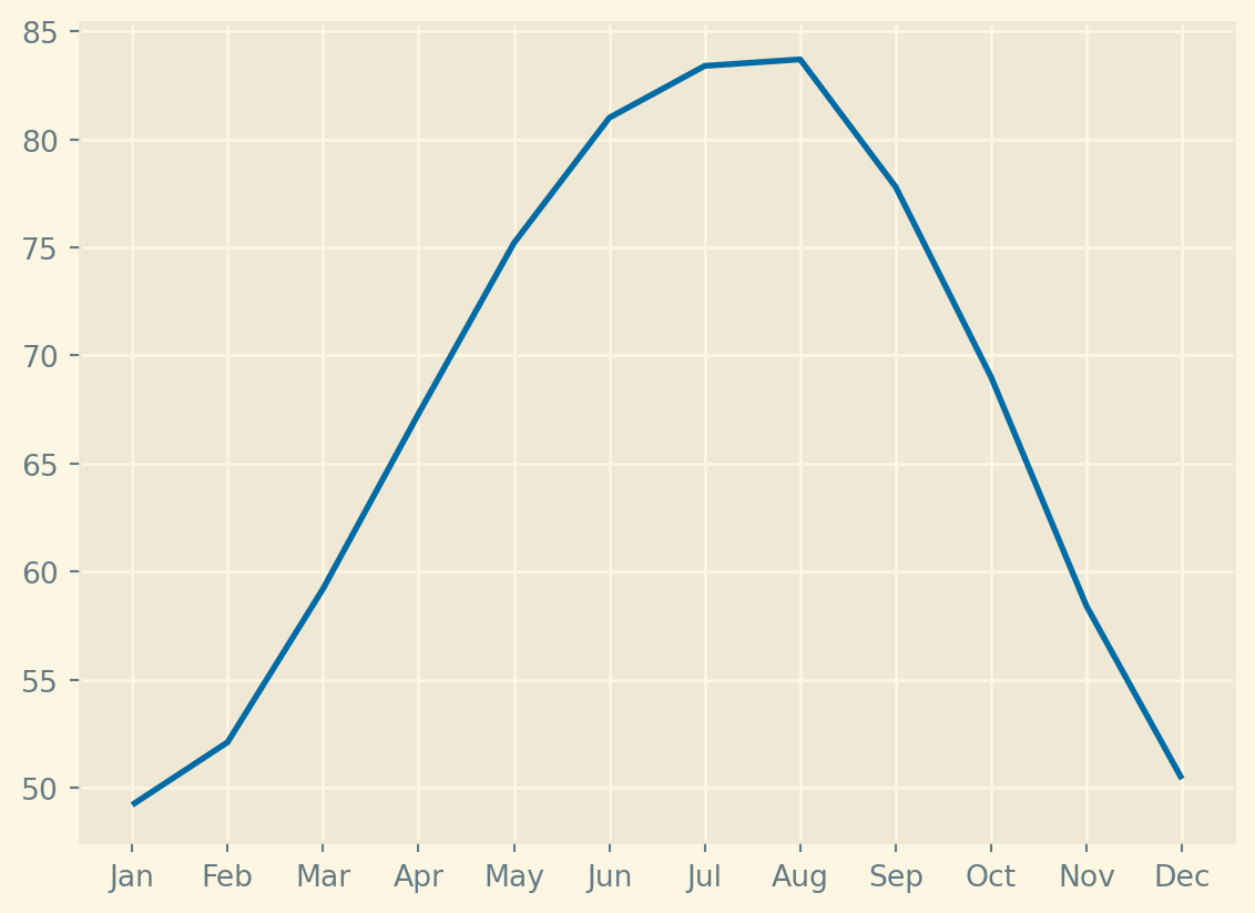 # Importing the course packagesimport pandas as pdimport numpy as npimport matplotlib.pyplot as plt# Importing the course datasets austin_weather = pd.read_csv("datasets/austin_weather.csv", index_col="DATE")weather = pd.read_csv("datasets/seattle_weather.csv", index_col="DATE")# Some pre-processing on the weather datasets, including adding a month columnseattle_weather = weather[weather["STATION"] =="USW00094290"] month = ["Jan", "Feb", "Mar", "Apr", "May", "Jun", "Jul", "Aug", "Sep", "Oct", "Nov", "Dec"] seattle_weather["MONTH"] = month austin_weather["MONTH"] = month# Use the "tableau-colorblind10" style and create new Figure/Axesplt.style.use("tableau-colorblind10")fig, ax = plt.subplots()ax.plot(austin_weather["MONTH"], austin_weather["MLY-TAVG-NORMAL"])plt.show()
