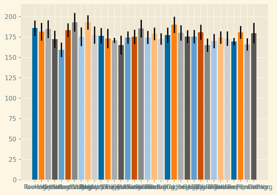 # Importing the course packagesimport pandas as pdimport numpy as npimport matplotlib.pyplot as plt# Importing the course datasets summer_2016 = pd.read_csv('datasets/summer2016.csv')# Extract the "Sport" columnsports_column = summer_2016['Sport']# Find the unique values of the "Sport" columnsports = sports_column.unique()fig, ax = plt.subplots()# Loop over the different sports branchesfor sport in sports:# Extract the rows only for this sport sport_df = summer_2016[summer_2016["Sport"] == sport] # Add a bar for the "Height" mean with std y error bar ax.bar(sport, sport_df['Height'].mean(), yerr = sport_df["Height"].std())