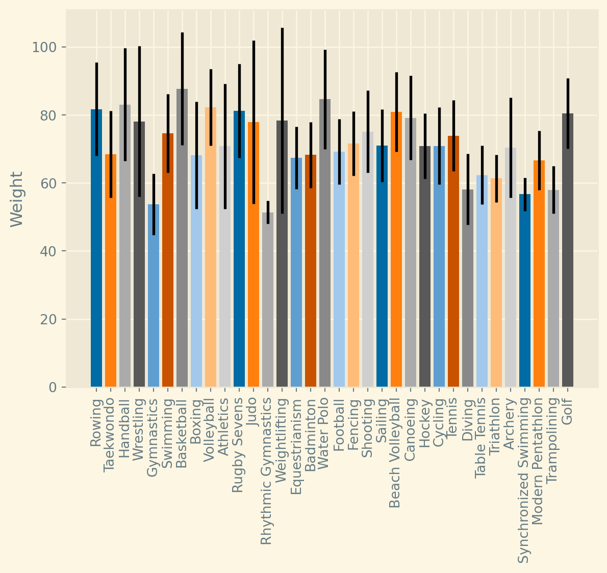 Add a bar to the provided ax object, labeled with the sport name, with the mean of the “Weight” column as its height, and the standard deviation as a y-axis error bar.