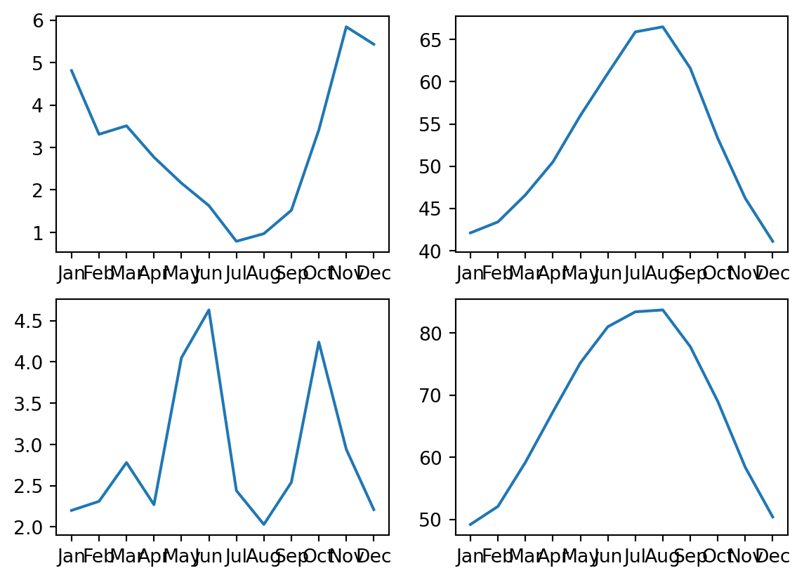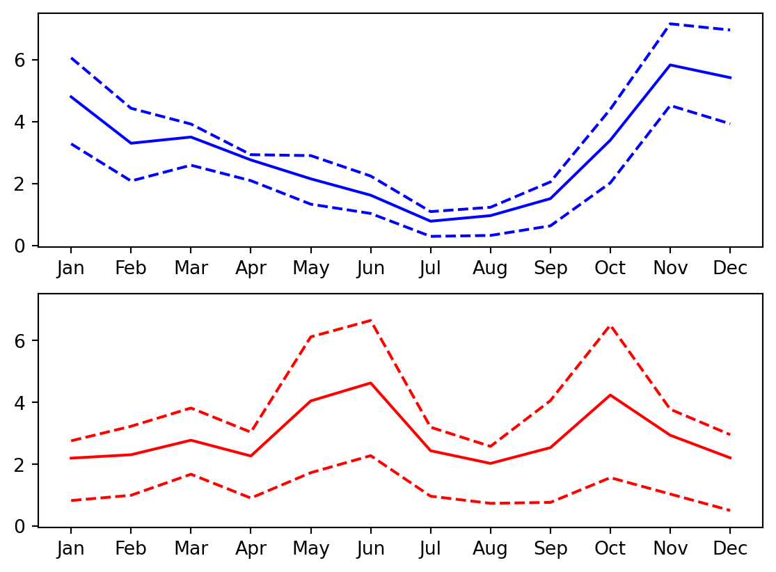 # Some pre-processing on the weather datasets, including adding a month columnseattle_weather = weather[weather["STATION"] =="USW00094290"] month = ["Jan", "Feb", "Mar", "Apr", "May", "Jun", "Jul", "Aug", "Sep", "Oct", "Nov", "Dec"] seattle_weather["MONTH"] = month austin_weather["MONTH"] = month# Create a Figure and an array of subplots with 2 rows and 2 columns.fig, ax = plt.subplots(2, 2)# Addressing the top left Axes as index 0, 0, plot the Seattle precipitation.ax[0, 0].plot(seattle_weather['MONTH'], seattle_weather['MLY-PRCP-NORMAL'])# In the top right (index 0,1), plot Seattle temperatures.ax[0, 1].plot(seattle_weather['MONTH'], seattle_weather['MLY-TAVG-NORMAL'])# In the bottom left (1, 0) and bottom right (1, 1) plot Austin precipitations and temperatures.ax[1, 0].plot(austin_weather['MONTH'], austin_weather['MLY-PRCP-NORMAL'])# In the bottom right (1, 1) plot month and Austin temperaturesax[1, 1].plot(austin_weather['MONTH'], austin_weather['MLY-TAVG-NORMAL'])# Small multiples with shared y axis# Create a Figure with an array of two Axes objects that share their y-axis range.fig, ax = plt.subplots(2, 1, sharey=True)# Plot Seattle's "MLY-PRCP-NORMAL" in a solid blue line in the top Axes.# Add Seattle's "MLY-PRCP-25PCTL" and "MLY-PRCP-75PCTL" in dashed blue lines to the top Axes.ax[0].plot(seattle_weather['MONTH'], seattle_weather['MLY-PRCP-NORMAL'] , color ='b')ax[0].plot(seattle_weather['MONTH'], seattle_weather['MLY-PRCP-25PCTL'], color ='b', linestyle ='--')ax[0].plot(seattle_weather['MONTH'], seattle_weather['MLY-PRCP-75PCTL'], color ='b', linestyle ='--')# Plot Austin's "MLY-PRCP-NORMAL" in a solid red line in the bottom Axes and the "MLY-PRCP-25PCTL" and "MLY-PRCP-75PCTL" in dashed red lines.ax[1].plot(austin_weather['MONTH'], austin_weather['MLY-PRCP-NORMAL'], color ='r')ax[1].plot(austin_weather['MONTH'], austin_weather['MLY-PRCP-25PCTL'], color ='r', linestyle ='--')ax[1].plot(austin_weather['MONTH'], austin_weather['MLY-PRCP-75PCTL'], color ='r', linestyle ='--')plt.show()