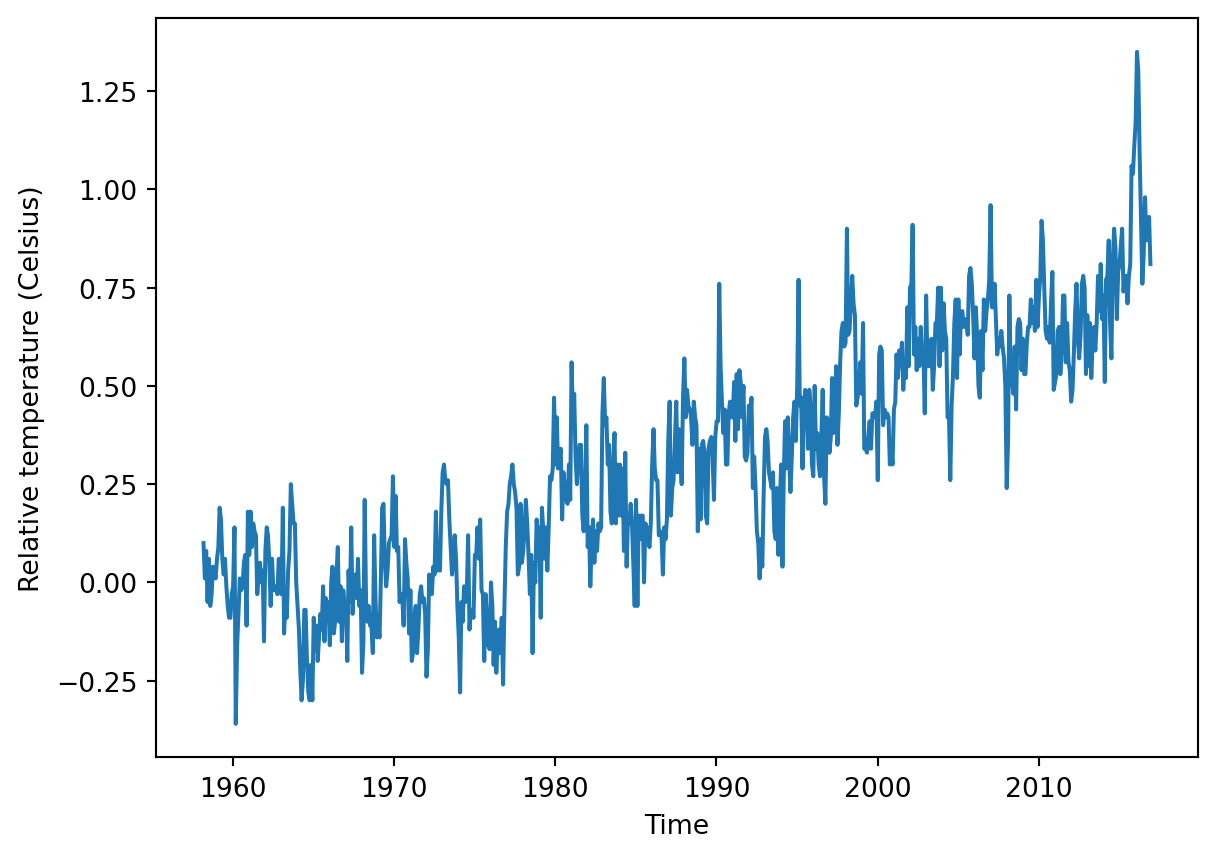 # Read in the data from a CSV file called 'climate_change.csv' using pd.read_csv.# Use the parse_dates key-word argument to parse the "date" column as dates.# Use the index_col key-word argument to set the "date" column as the index.climate_change = pd.read_csv('datasets/climate_change.csv', parse_dates=["date"], index_col="date")# Read the top 5 rowsprint(climate_change.head(5))# Plot time-series data# Add the data from climate_change to the plot: use the DataFrame index for the x value and the "relative_temp" column for the y values.fig, ax = plt.subplots()# Add the data from climate_change to the plot: use the DataFrame index for the x value and the "relative_temp" column for the y values.ax.plot(climate_change.index, climate_change['relative_temp'])# Set the x-axis label to 'Time'.ax.set_xlabel('Time')# Set the y-axis label to 'Relative temperature (Celsius)'.ax.set_ylabel('Relative temperature (Celsius)')# Show the figureplt.show()