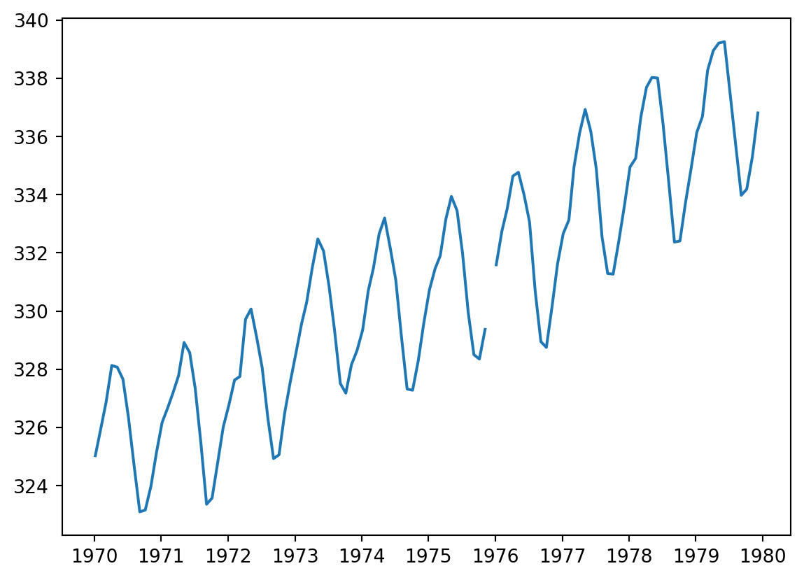 The other two columns in the data are stored as regular columns of the DataFrame with a floating point data-type, which will allow us to calculate on them as continuous variables. There are a few points in the CO2 data that are stored as NaNs or Not-a-Number. These are missing values where measurements were not taken.
