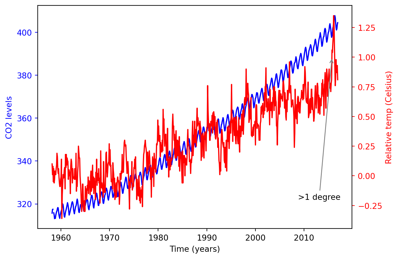 Using climate_change, create a twin Axes object with the shared x-axis as time. There should be two lines of different colors not sharing a y-axis: co2 and relative_temp. Only include dates from the 2000s and annotate the first date at which co2 exceeded 400.