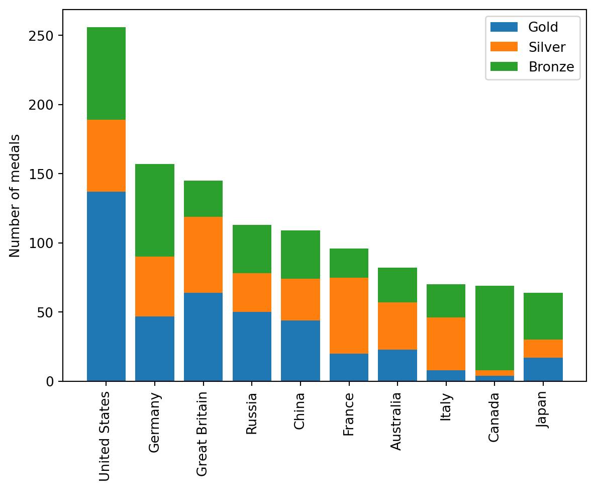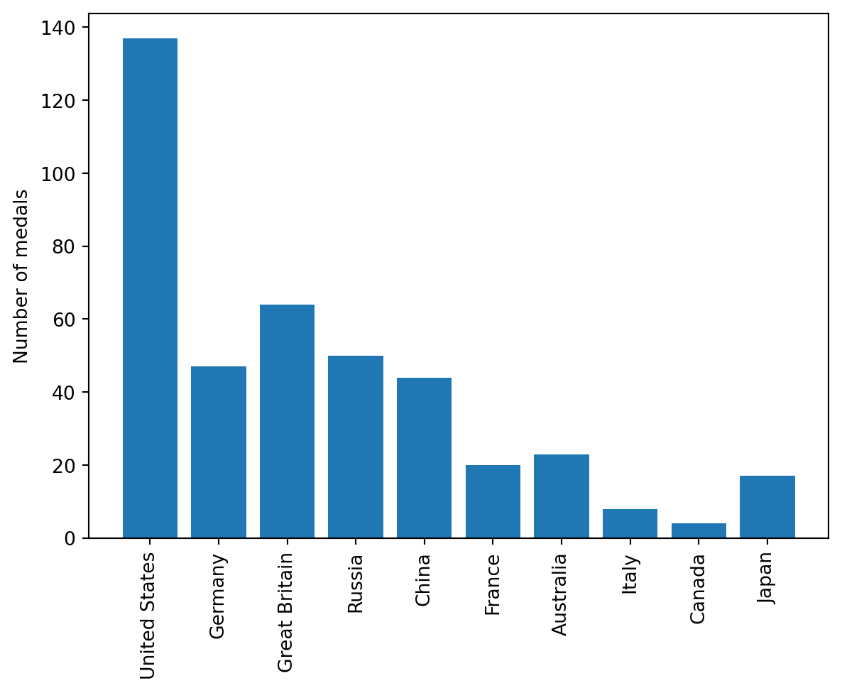 # Importing the course datasets medals = pd.read_csv('datasets/medals_by_country_2016.csv', index_col=0)print(medals.head(5))# Bar chartfig, ax = plt.subplots()# Plot a bar-chart of gold medals as a function of countryax.bar(medals.index, medals["Gold"])# Set the x-axis tick labels to the country names and rotate the x-axis tick labels by 90 degrees by using the rotation key-word argument.ax.set_xticklabels(medals.index, rotation =90)# Set the y-axis labelax.set_ylabel("Number of medals")fig.savefig("gold-underscore-medals.png")